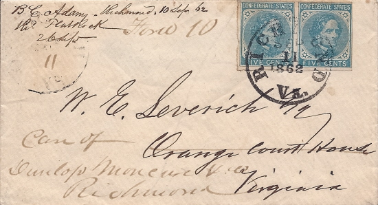 CDS Powell Type 3f 11 SEP 1862. Addressed to W. E. Leverich Esq, Orange