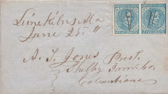 OTC16 | CSA #7 Horz Pair (margin close at top left and filled in frame at right) pen-cancelled and manuscript “Lime Kiln, Ala June 25th (1863)” at the left. Addressed to A. T. Jones Prest, Shelby Iron Co, Columbiana (Alabama). Blue paper folded letter complete. Short business letter concerning the purchase of iron. Very Fine. | SOLD |