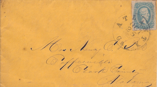 OTC23 | CSA #11 (AD) (4-Margin) tied by the Atlanta, Ga CDS 25 OCT (1863). Addressed to Mrs. Nancy C. Bell, Coffeeville Clarke County, Alabama. The addressee’s husband was Capt John W. Bell of Co H 32nd Ala Inf, an Army of Tennessee unit, and most likely sent this letter home to his wife. Capt Bell Died of Disease at the Cassville, Ga hospital 2/14/1864. Very Fine Cover. | SOLD |