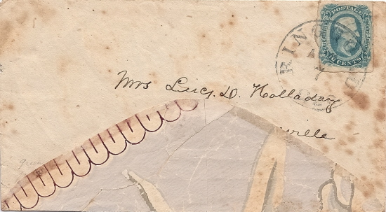 OTC27 | CSA #12 (AD) tied by the BLUE Ringgold, Ga CDS 7 AUG. Wallpaper Cover with a gray, white and brown floral design and a geometric border displayed flapped up from the bottom. Addressed to Mrs. Lucy Holladay, Tollersville, Louisa Co., Va. Spotty light foxing. | SOLD |