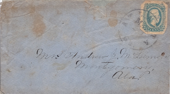 OTC28 | CSA #11 (AD) (4-Margin) tied by the Atlanta, Ga CDS 20 MAR. Blue paper cover addressed to Mrs. Andrew J. McLemore, Montgomery, Ala. Top edge repairs and backflap replaced to a very presentable appearance. | SOLD |
