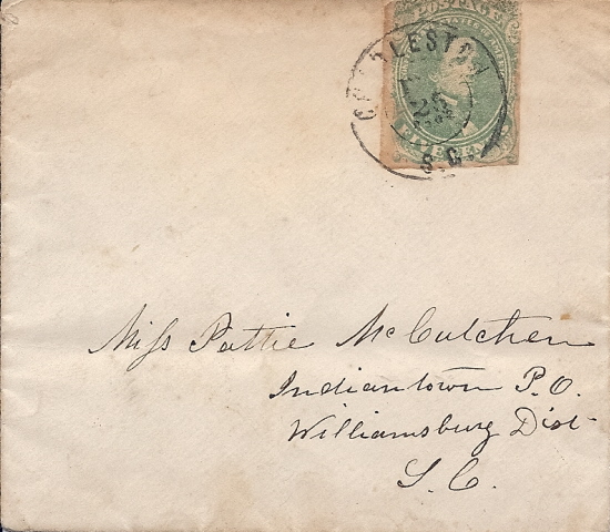 OTC3 | CSA #1 Stone 1 (not plated) (margin touches at the top and edge gum toning) tied by the small double circle Charleston SC CDS 25 FEB 1862. Addressed to Miss Pattie McCutchen, Indiantown PO, Williamsburg Dist SC. Square shaped complete cover with a very clean appearance. | SOLD |