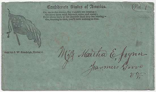 America"), and Imprint 31 ("Sold by J. W. Randolph, Richm'd). Addressed to Miss Martha E. Joyner, Farmer's Grove, Va. Top back flap missing, and minor edge wear. Very clean cover. |