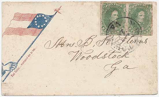 CSA #1 Horz Pair Stone 1 Positions 6-7 (margin just in at right with a little edge gum toning at right) tied by the Yorktown, Va CDS 18 APR (1862). Stars and Bars Patriotic Cover (11-Stars) Type F11-9 in