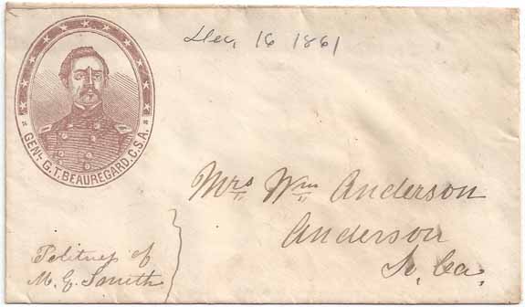 General Beauregard Oval Portrait in Brown Patriotic Cover (CC Type MS-1) handcarried outside the postal system addressed to Mrs. Wm Anderson, Anderson, So. Ca. Manuscript at lower left "Politeness of M. G. Smith" the name of the person who carried the cover. The cover is also dated at the top in manuscript "Dec 16, 1861." There is no enclosure. Very Fine.