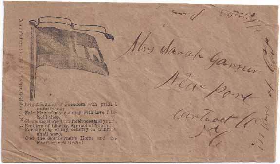 Included with the cover is the original letter written on a Patriotic Lettersheet with a Flag Over Cannon (12-Stars) design in black Type CN-3 with the same Verse 5 and the same Imprint 17 as are on the cover. The letter is datelined "Fort Harrison March 9th 1862"
