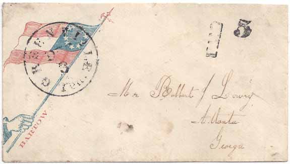 PAT415 | Stampless cover with the Greenville, Tenn CDS 3 DEC (1861) and handstamp PAID 5 Type A. Stars and Bars (11-Stars) Patriotic Cover in full color Type F11-9 with Slogan 3 "BARTOW." Addressed to Mr. Robert J. Lowry, Atlanta, Georgia. Part of top back flap missing, minor edge faults, and a minor reduction at the top. Still a clean appearing and presentable cover. | $850.00 |