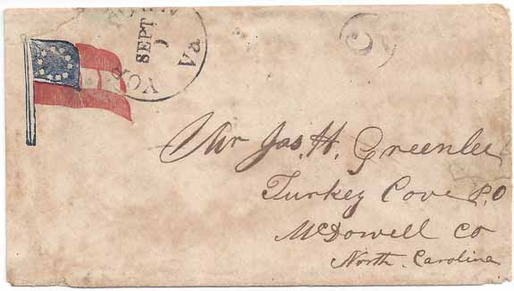 Stampless Patriotic Cover with the Yorktown, Va CDS with a SEPT (1861) date and handstamp "5" in a circle Type H. Stars and Bars in full color (10-Stars) Type F10-3.