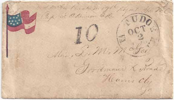 Stampless Soldiers (Due) cover with the Tudor Hall, Va CDS and the handstamp (Due) 10 Type F 2 OCT 1861. CSA Patriotic Cover with the Stars and Bars (11 Stars) in full color Type F11-13 (Scarce Flag Design). Addressed to Mrs. L. M. McGee, Goodmans X Roads, Harris Cty, Ga. Endorsed at top "M. S. McGee Private in 17th Regmt Ga Vol Cap R. E. Kennon Co H." A little edge and corner wear.