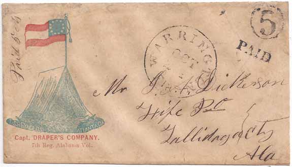 Stampless Patriotic Cover with the Warrington, Fla CDS and handstamp PAID 5 Type B 24 OCT (1861). Stars