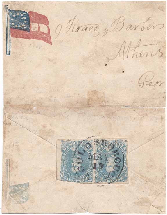 CSA #4 Horz Pair Stone 2 (not plated) (margins a bit irregular) affixed to seal the back flap and tied by the Goldsborough NC CDS 17 MAY. Addressed to Reace Barbers, Athens, Geor. Stars and Bars Patriotic Cover (10 Stars) Type F10-3 in full color.