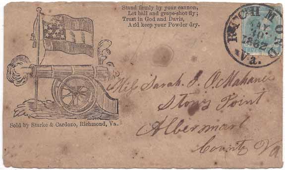PAT440 | CSA #6 (small clip at the left lower corner) tied by a full strike of the Richmond, Va CDS Powell Type 3a 30 MAY 1862. Single use of the London Print stamp prior to the rate change. Addessed to Miss Sarah J. O. Mahanes, Storey Point, Albermarl(e) County, Va. Flag (12-Stars) Over Cannon Patriotic Cover in black Type CN-1C with Verse 39 ("Stand firmly by your cannon,..."), and Imprint 32 ("Sold by Starke & Cardozo, Richmond, Va."). Some light foxing and minor edge wear. | $750.00 |