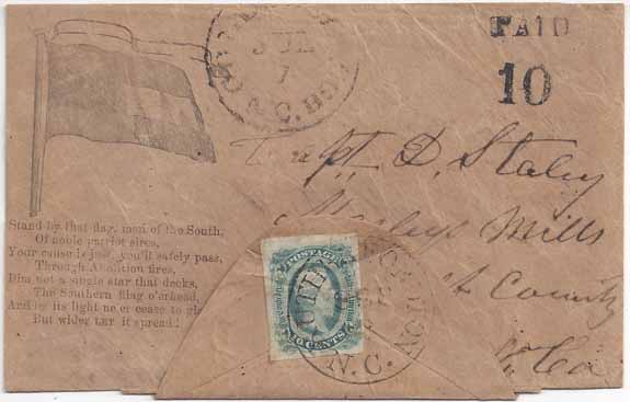 display of the patriotic design. Very clean cover. First Use -- The side with the patriotic design which has been turned to the outside. Stampless PAID use with the Goldsborough NC CDS 7 JUL with handstamp PAID 10 Type C. Addressed to Capt D. Staley, Marleys Mills, Randolph County, N. Ca. Stars and Bars (10 Stars) Type F10-11 in Black with Verse 37 ("Stand by that flag, men of the South...". This design is usually seen with a Goldsboro Printer's imprint (Imprint 17) along the left edge. It appears that the imprint was cut off when the cover was refolded for the turned use. Second Use -- CSA #12c Greenish-Blue (AD) tied by the Rutherfordton NC CDS 2 SEP. Addressed to Col J. W. Staley, Troys Store (Randolph County) NC. The Staley family was prominent in Randolph County, North Carolina. There was no Col Staley that served in the Confederate Army, so the "Col" designation was most likely honorary or perhaps an old state rank. Unable to identify a Capt Staley in the Confederate Army so assume it was a state militia rank. Needs more detailed research on the Randolph County, North Carolina, Staley family. |