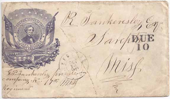 in northen Mississippi. The "DUE 10" handstamp is not a Leesburg mark. The cover was routed through Memphis, Tenn., and the "DUE 10" handstamp applied in transit in Memphis (Type H) to assess the unpaid postage. Endorsed at bottom left "G. P. Tankersley private in company K 17th Miss Regiment." Cover