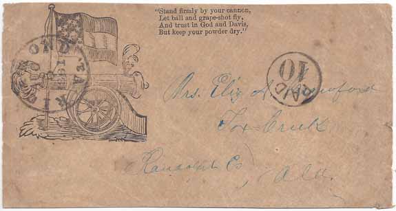 | PAT448 | Stampless PAID Patriotic Cover with the Richmond, Va Powell Type 1a1 and handstamp PAID 10 in a circle Type H 5 AUG 1861. Flag Over Cannon in Black Patriotic Cover 12-Stars (Type CN-1C variation with the stars in a haphazard pattern and the smoke from the cannon complete) with Verse 39 "Stand firmly by your cannon..." Printed on rather coarse paper. Addressed to Mrs. Eliz A. Crawford, Fox Creek, Randolph Co., Ala. Very clean and attractive cover. | $650.00 |