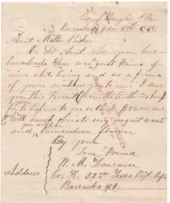 The letter is datelined "Camp Douglas, Ill Barracks 41 Jan 28 1865." and is signed "W. M. Tourance, Co K 32nd Texas Regt Inf Barracks