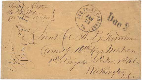 Handstamp Due 3 which are Union marks applied at the transfer point. No Confederate postage so cover was most likely handcarried to Old Point Comfort (perhaps by an exhanged or paroled prisoner) or sent under a separte cover where it entered the Union postal system. Endorsed at upper left “Soldiers Letter C. W. Tilden Col 16th Me Vol” with a Military Addressed to Lieut Col A. B. Farnham, Comng 16th Reg Me Voln 1st Brigade 2nd Div 1st A C (Army Corps), Washington DC. Cover originated at Libby Prison in Richmond, Va. Backflap missing but still a Very Fine Libby Prison POW cover with a very interesting history.