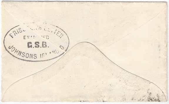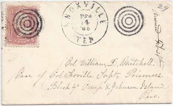 USA #65 (very nice stamp) tied by a full Target Cancel with a second strike of the same target at the right and the Knoxville, Ten Union occupied double ring CDS 14 FEB 1865 (yeardate in the CDS). POW cover from late in the war but not through-the-lines. Addressed to Col William D. Mitchell Care of Col Scovill Supt. Prisoners, Block 4, Camp 8, Johnson Island, Ohio. On the reverse is the "Johnson's Island O Prisoner's Letter Examined G. S. B." (George S. Brown 128th OVI 11/5/1864 - 6/14/1865) (CC PWH-25 Type A). Very Fine.