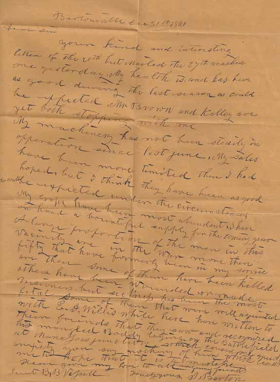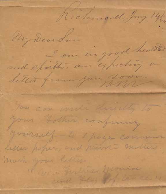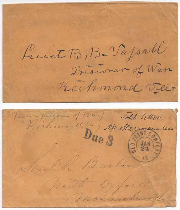 covers. First Cover - Addressed to Lieut B. B. Vassall, Prisoner of War, Richmond, Va. No postal markings and no examiner's markings. Very likely hand delivered. The original one page letter is with the cover. The letter is datelined "Bartonsville Dec 31st 1861" and is from Lieut Vassall's uncle S(tephen) Barton. Bernard Barton Vassall (1835-1895) from Oxford, Mass., a nephew of Clara Barton who founded the American Red Cross, entered Union service as 2nd Lieut of Co E 15th Mass Inf 7/30/1861. Lieut Vassall was captured as a POW at Balls Bluff (Va) 10/21/1861 and confined in Richmond at the Ligons Tobacco Warehouse Prison. He was exchanged 2/21/1862 and rejoined his unit and was promoted 1st Lieut 8/6/1862 but resigned 11/6/1862. He had later service as a Hospital Steward in Washington DC. After the war, he lived in Webster, Mass. Stephen Barton (1806-1865), brother of Clara Barton and Lieut Vassall's uncle, is listed on the Federal Census of 1860 as a lumberman in Hertford County, North Carolina, where he relocated from Massachusetts. Bartonsville NC is a listed post office in that county and was centered around Stephen Barton's lumber mill. Stephen Barton was also the postmaster. Somehow he had the letter privately delivered to his POW nephew in Richmond who had spent some time working for him in his lumber business in North Carolina before the war. Second Cover -- South-to-North through-the-lines POW cover from Ligons Tobacco Warehouse Prison to Massachusetts. When Lieut Vassall received the letter from his uncle, he used the back of the letter to write a short note to his cousin in Massachusetts to let his cousin know he was all right and include instructions to his cousin on how to write to his father in North Carolina. "You can write directly to your Father, confining yourself to 1 page common letter paper and private matters". He then forwarded the original letter with his note in a separate envelope to his cousin. The cover is endorsed at upper left "From a prisoner of war Richmond Va" and addressed to Saml R. Barton, North Oxford, Massachusetts. The cover was taken to the transfer point perhaps as part of a large group of letters by courier this early in the war as there is no CSA postage. At the transfer point the cover received the Old Point Comfort, Va Union postmark dated 24 JAN (1862) and handstamp DUE 3 as the Union postage was not pre-paid. Union examiner's mark at upper right "Sold(ier's) Letter Mjr (Major) von Herrmann USA." Two covers with a very interesting history and important covers to the story of Ligons Tobacco Warehouse which closed as a prison in early 1862. Galen Harrson illustrates another Ligons cover from the Vassall Correspondence to his cousin in his book Prisoner's Mail of the American Civil War. It really is amazing that these two covers and the letter have remained together after all these years. |
