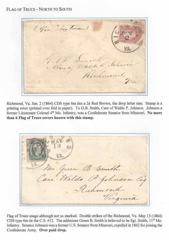 POW216 | Two Covers -- Civilian Flag of Truce North-to-South (same correspondence) (Not POW) First Cover -- CSA #8 (margin touches at left but with a spectacular pre-printing paper fold at the lower left corner affixed sideways) tied by the Richmond, Va CDS 2 JUN (1864) Powell Type 6m. Addressed to G. B. Smith Care of Waldo P. Johnson, Richmond, Va. At upper left in manuscript “Via Flag Truce” in the same hand as the address. The cover is a very unusual Richmond Drop Letter and a Civilian Flag of Truce cover. This would be the inside cover of the Through-the-Lines use with the outside cover containing the Union postage having been discarded at the transfer point. Therefore, the cover required only the CSA drop letter rate as Richmond was the final destination. The point of origin in the North is not known as the outer cover was discarded, and there is no enclosure. Cover very possibly originated in Union Missouri. Cover has a small stain at top center and a very minor reduction at the left but is otherwise Very Fine with an unusual and very scarce postal use combining the 2c Red-Brown stamp with Drop Letter and Civilian Flag-of-Truce postal use. Galen Harrision's research indicates that no more than six Flag of Truce covers are known with the 2c Red-Brown stamp. Ex- Harrison Exhibit. Second Cover -- CSA #12 (AD) (margin close at the top) tied by two strikes of the Richmond, Va CDS 13 MAY (1864) Powell Type 6m. Same correspondence as the first cover but in a different hand. Addressed to Mr. Green B. Smith Care Waldo P. Johnson Esq, Richmond, Virginia. Richmond Overpaid Drop Letter. This cover is not marked as a Flag of Truce cover but is dated only a few weeks before the first cover and could very well be an unmarked through-the-lines cover. There is no enclosure. Part of top back flap missing, otherwise Very Fine. Ex- Galen Harrison Exhibit. Waldo Porter Johnson (1817-1885) in 1861 was a US Senator from Missouri and was expelled from the US Senate 1/10/1862 for disloyalty to the USA as he had joined the Confederate Army. He served as Major of the 1st Missouri Battalion (CSA) and then Lt Col of the 4th Missouri Infantry (CSA) and was twice wounded at Pea Ridge. He later served as a Confederate Senator from Missouri from late 1863 until the end of the war. After the war, he spent a year in exile in Canada before returning to Missouri. The addressee, Green B. Smith, is not identified but believed by Galen Harrision to possibly be Sgt Green B. Smith of Co F 11th Missouri Infantry (CSA). Sgt Green B. Smith was placed on the CSA Roll of Honor for bravery at the Battle of Jenkins Ferry (Ark) in April 1864. These two covers complement each other and will only be sold as a pair on the exhibit page. |