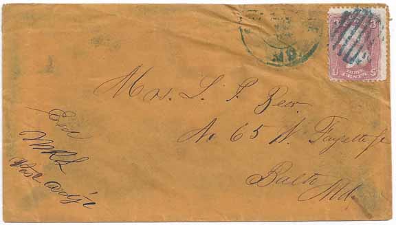 locally to Mrs. L. P. Beer, No 65 W Fayette St, Balt(imore) Md. The stamp overpays the local delivery by 1c.