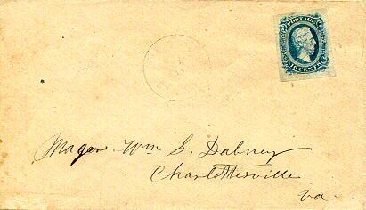 CSA #11 (AD) (4-Margin) Pen-Cancel with a light but legible strike of the Cobham Va C RR (Virginia Central Railroad) CDS to the left (date not fully apparent). Very clean cover which is not from the Rives Correspondence but is addressed instead to Major Wm S. Dabney, Charlottesville, Va. The addressee was not associated with the CSA Army but was a prominent planter in the Charlottesville area. |