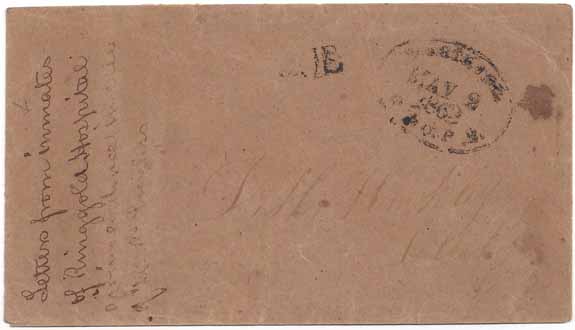 RR69 | Stampless cover with the Wartrace N & C RR (Nashville & Chattanooga Railroad) oval postmark 2 MAY 1862 and handsatmp DUE (no rate). Coarse brown paper cover addressed to T. H. Hinkley, Tallahassee, Fla. Docketing at left "Letters from inmates of Ringgold Hospital" plus two additional lines partially rubbed away. Coarse brown paper cover with a very clean appearance. | $450.00 |
