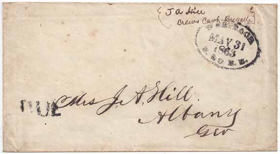 Stampless Soldiers DUE cover with quite a good strike of the Wartrace N & C RR (Nashville and Chattanooga Railroad) and handstamp DUE (no rate) 31 MAY 1863. Addressed to Mrs J. A. Hill, Albany, Geo. Endorsed at top right "J A Hill Crews Cav Brigade." Minor sealed back flap opening tear, otherwise Very Fine. Ex-Hannen CSA Railroad Collection.