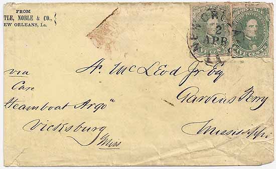 an unnamed packet) where it was to be connected with the Argo at Vicksburg for the Yazoo River run to its final destination on the Sunflower River. In May 1863, the Argo was burned by the Confederates in a small bayou of the Sunflower River to prevent capture by the Union. The Argo is not listed as a Confederate packet in the new CSA catalog. The cover is also an Advertising Cover with a printed corner card upper left "--tle, Noble, & Co., New Orleans, La."