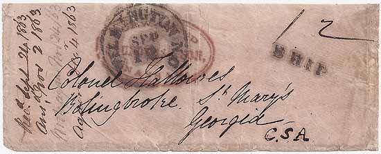 locked bag was transferred to the Cunard West Indies steamship Corsica arriving in Nassau 8/19/1863 where the bag was opened. The cover bears the red oval Nassau forwarder's handstamp of Saunders and Son. Carried into Wilmington by the blockade runner Alice where it received the Wilmington NC CDS 12 SEP (1863) and SHIP handstamp with manuscript "12'
