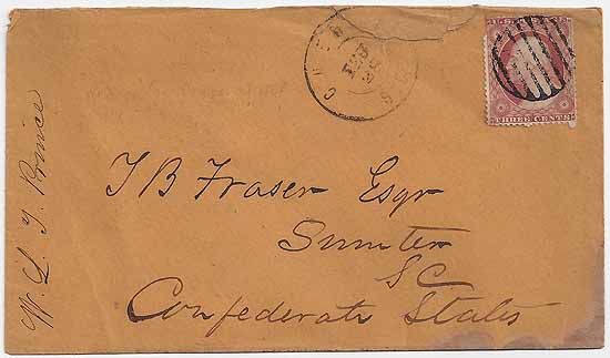 | SR6 | USA #26 Grid Cancel with the small double circle Cheraw SC double circle CDS 28 FEB (1861). Addressed to T. B. Fraser Esqr, Sumter SC Confederate States. US Mail Service within Confederate South Carolina. Unusual to have "Confederate States" used in the address. The addressee, T. B. Fraser from the Sumter District, would later serve as a Captain and Quartermaster of the 9th SC Inf. Sealed top edge tear involving the postmark. | $50.00 SOLD |