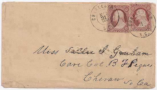 | SR7 | USA #26 (two singles paying a double weight rate) tied together and to the cover by two strikes of the small double circle Charleston SC CDS 31 MAY 1861. Last Day of US Mail Service in the Confederate States. Addressed to Miss Sallie I. Graham Care Col B. F. Pegues, Cheraw, So. Ca. An attempt to obliterate the name of the addressee was unsuccessful. Cover has a very clean overall appearance. Ex-Antrim, Ex-Calhoun, Ex-Kaufmann. | $400.00 SOLD |