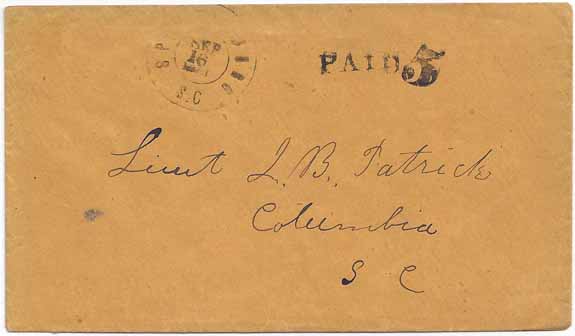 | SC1126 | Stampless cover with the small double circle Spartanburg SC CDS and handstamp PAID 5 16 SEP (1861). This particular PAID 5 handstamp is not currently listed in the CSA catalog. Addressed to Lieut J. B. Patrick, Columbia SC. Unable to accurately identify the addressee. Very Fine Ex-Emerson, Ex-Cole, Ex-Oswald. | $200.00 |