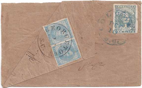 Turned Cover -- 1st Use (inside) CSA #7 Horz Pair (4-Margin and looks to be on London Paper) tied by the Georgetown SC CDS with a NOV 1862 date and addressed to Mr. Pringle Smith, Columbia SC. 2nd Use (outside) CSA #2e Paterson Stone Y Greenish-Blue (4-Margin) tied by the BLUE Columbia SC