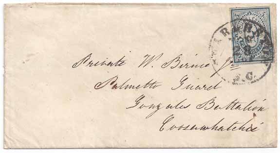 CSA #16x1 5c Blue Charleston Provisional (4-Margin with complete outer frame at top and bottom) tied by the large single rim Charleston SC CDS 28 NOV (1861). Military Address to Private W. Birnie Jr, Palmetto Guard, Gonzales Battalion, Coosahatchie (SC). Back flap opening tears, otherwise Very Fine. Ex-Calhoun.
