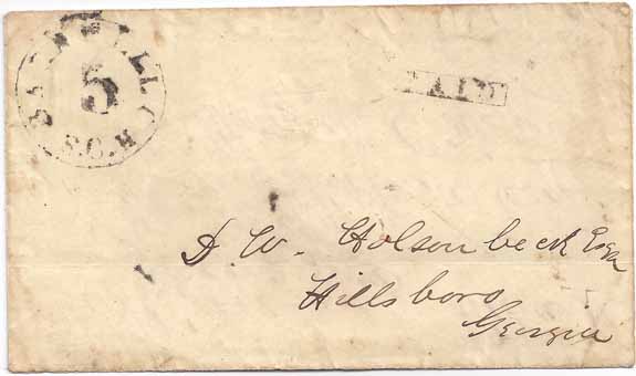 Turned Cover -- First Use: Stampless CSA #123xu1 Barnwell CH (Court House) SC PAID 5 Provisional (not dated) to D. W. Holsenbeck Esq, Hillsboro, Georgia. Second Use: Stampless “Hillsboro, Ga Paid 10 Dec 23rd (1862)”