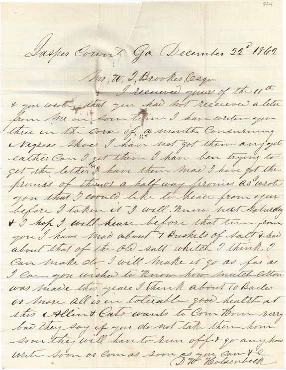 County Ga December 22nd 1862." The letter concerns shoes for Negro