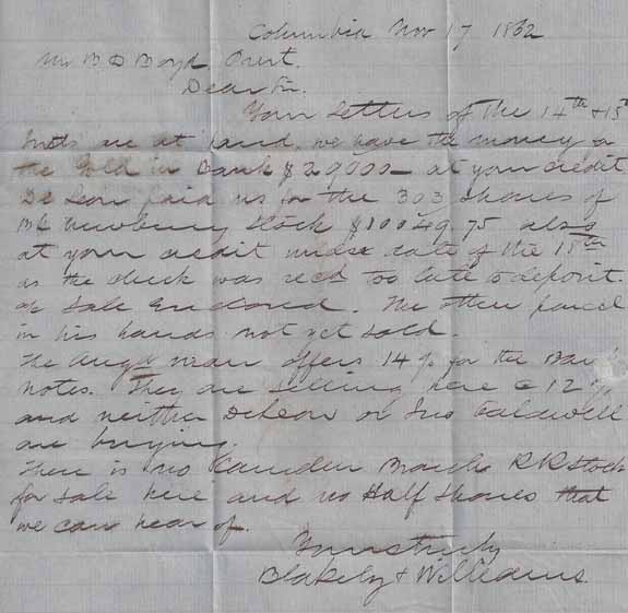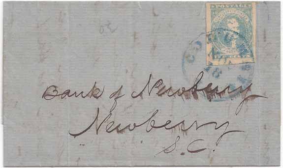SC1234 | CSA #2e Paterson Stone Y Light Milky Blue (4-Margin) tied by the BLUE Columbia SC CDS 18 NOV (1862). Blue paper folded letter addressed to Bank of Newberry, Newberry SC. Short one page letter apparently dealing with a stock purchase. Very Fine with an exceptionally nice Stone Y stamp. PF Certificate 2006. | $400.00 |