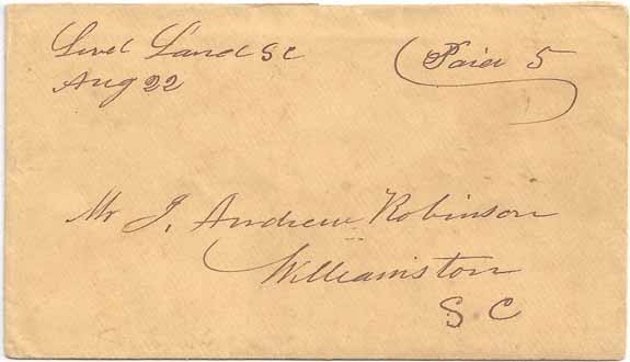 | SC1237 | Stampless cover "Level Land SC Aug 22 (1861) Paid 5" all in manuscript. Addressed to Mr J. Andrew Robinson, Williamston SC. Obscure use from the Abbeville District. Very Fine. | $200.00 |