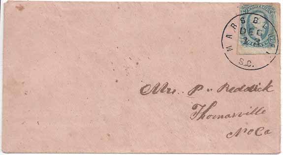 | SC1300 | CSA #12 (AD) (margin just in at the top) tied by a full strike of the Mars Bluff SC CDS 13 DEC. Addressed to Mr. P. Reddick, Thomasville NC. Very clean cover. | $125.00 |