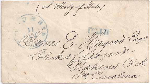 Pickens C..H., So. Carolina. Notation at the top "ch Secty of State."