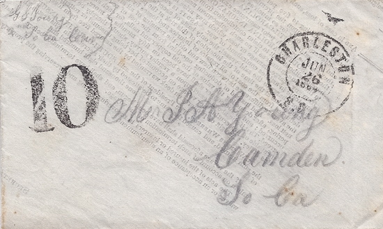 | SC827 | Soldiers (Due) 10 handstamp Type D with the small double circle Charleston SC CDS 26 JUN 1864. Adversity Cover made from a printed Maritime Insurance Form. Addressed to Mr. J. A. Young, Camden SC. Endorsed at upper left “G. G. Young 2nd SC Cav.” The sender, George Graham Young (1823-1897), was the brother of the addressee, John Andrew Young (1808-1882). Very Fine. | $350.00 |