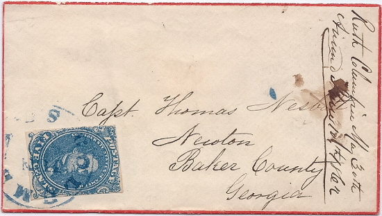 service. At the time of this cover, he was serving in the 9th Regt Georgia State Troops and was later in 1864 Major of the 1st Ga Infantry Militia unit. Very Fine Ex-Monroe Collection. |