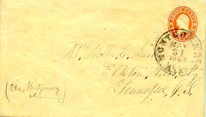RT32 | USA Star Die with the Montgomery, Ala CDS 31 MAY 1861 Last Day USA Used in the CSA. Addressed to Mrs. Mollie E. Austin, Elkton Giles County, Tennessee C.S. From Confederate Alabama to Independent Tennessee. The use of C. S. in the address identifying Tennessee as a Confederate State is not correct as Tennessee did not join the CSA until 2 JUL 1861. Very Fine. Ex-H. Green. | SOLD |
