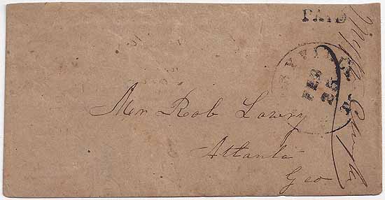 TN155 | Handstamp PAID (no rate) with a partial but very recognizable strike of the Shelbeyville, Ten CDS 25 FEB Dietz Type II. Coarse paper homemade cover addressed to Mr. Rob Lowry Atlanta, Geo. Some backflap tears but otherwise Very Fine. | $150.00 |