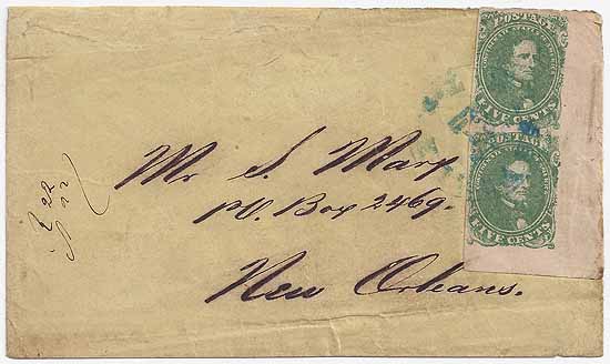 | TN276 | CSA #1 Stone 2 Vert Pair from the right lower corner Positions 40, 50 (90, 100) (4-Margin with large sheet margins right and bottom and a few very light barely noticeable small scuffs) tied to cover by the usual somewhat blurred strike of the Blue Nashville, Ten CDS 21 JAN (1862). Yellow paper cover addressed to Mr. S. Mary PO Box 2469 New Orleans. Part of backflap missing and a little edge wear but otherwise very clean with an excellent position pair of stamps. Ex-Gallagher. | $550.00 |