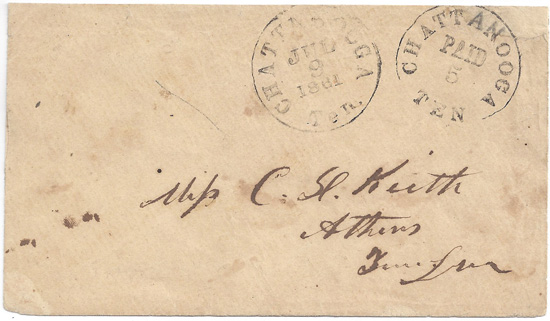 TN361 | CSA #17xu2 Chattanooga, Ten PAID 5 Provisional 9 JUL 1861. Addressed to Miss C. H. Keith, Athens, Tennessee. Upper right corner repaired which includes a small part of the upper right of the provisional mark. Clear strikes of the postal markings and still quite an attractive and scarce cover. There are only five covers recorded in the Crown Survey. This cover is one of the five reported on Page 405. Ex-Hart. | $1,500.00 |