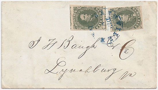 TN368 | CSA #1c two singles Stone A/B Olive Green (one with 4 large margins and the other just touching at the lower right) tied together and to the cover by the BLUE Nashville, Ten CDS 20 DEC (1861). Addressed to J. F. Baugh, Lynchburg, Va. Nice stamps and a clean cover. | $400.00 |