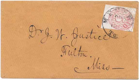 | TN412 | CSA #56x2 5c Red Memphis Provisional (4-Margin but a little close at the right) tied by the Memphis,Ten CDS with a DEC 1861 date. Orange paper cover addressed to Dr. J. W. Justice, Fulton, Miss. Very Fine. PF Certificate 1994 which mentions a light diagonal crease in the lower left margin of the stamp as well as a little gum toning at the top of the stamp. Both notations on the certificate are minor and of no real consequence. | $1,000.00 |