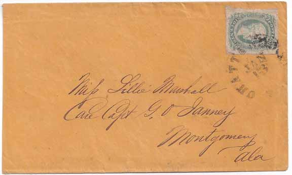 G. O. Janney, Montgomery, Ala. Very clean cover. The cover was sent by John Hunt Higley (1830-1889) to his future wife whom he would marry in February 1865. He was promoted Lt Col of the 40th Ala Inf 5/1/1862. He was later promoted Colonel of the regiment. The 40th Ala Inf was a Western Theater Army of Tennessee unit. After the war, Col Higley was engaged in the insurance business in Mobile, Ala. Capt George Oliver Janney (1834-1894) was a CSA staff officer and held the post of Commissary of Subsistence in Montgomery, Alabama. The connection between Capt Janney and Miss Marshall, the addressee, is not known. They may have been related. |